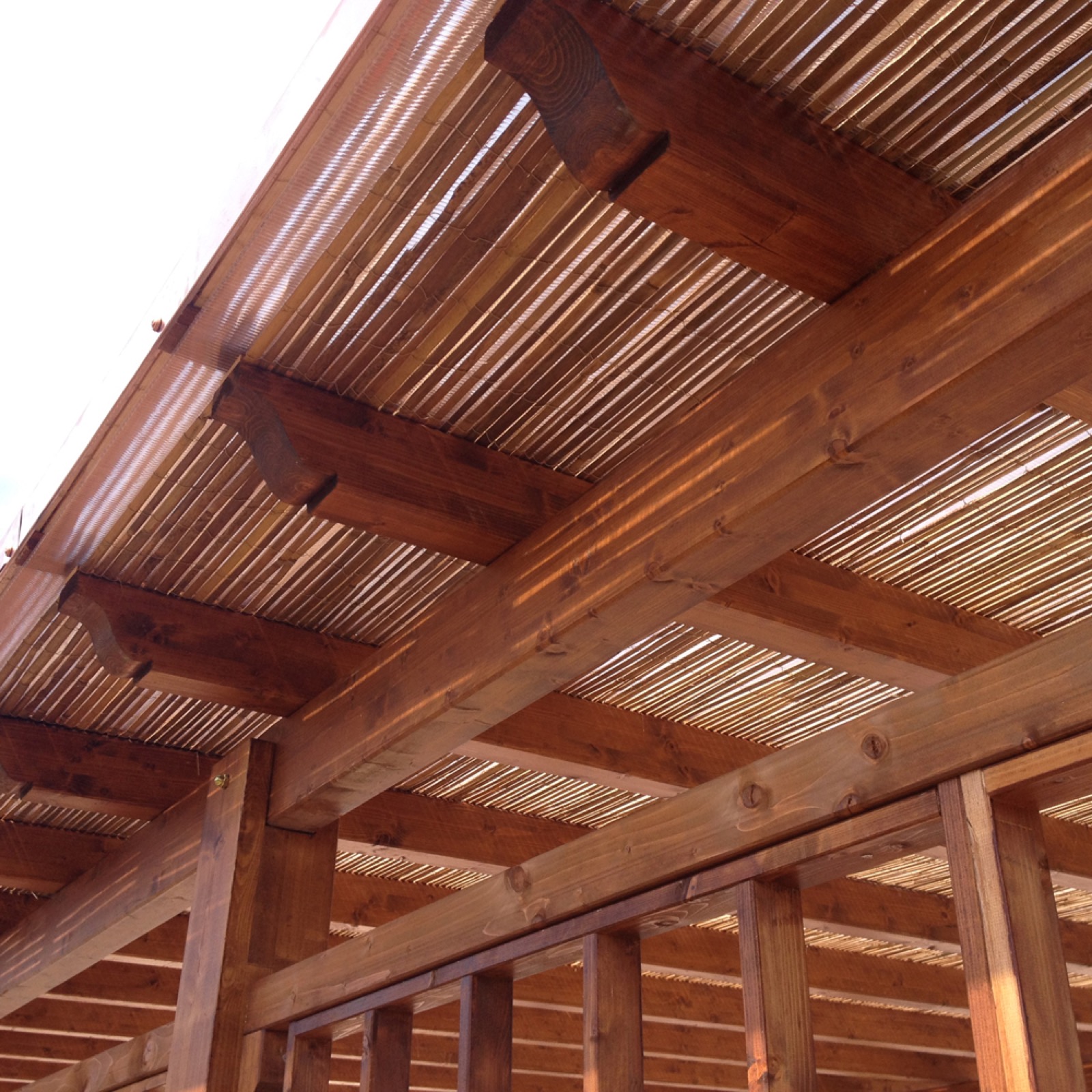 È possibile realizzare anche un pergolato con funzione ombreggiante con una sorta di copertura amovibile in qualsiasi momento. Come? Sovrapponendo uno stratodi bamboo, un foglio di vetroresina piana, una serie di listelli distanziatori e per finire un ultimo strato di bamboo. Questi arredi possono essere posizionati a terra tramite piastre e bicchieri sia su lastricati in porfido, in cotto che su pavimenti flottanti.